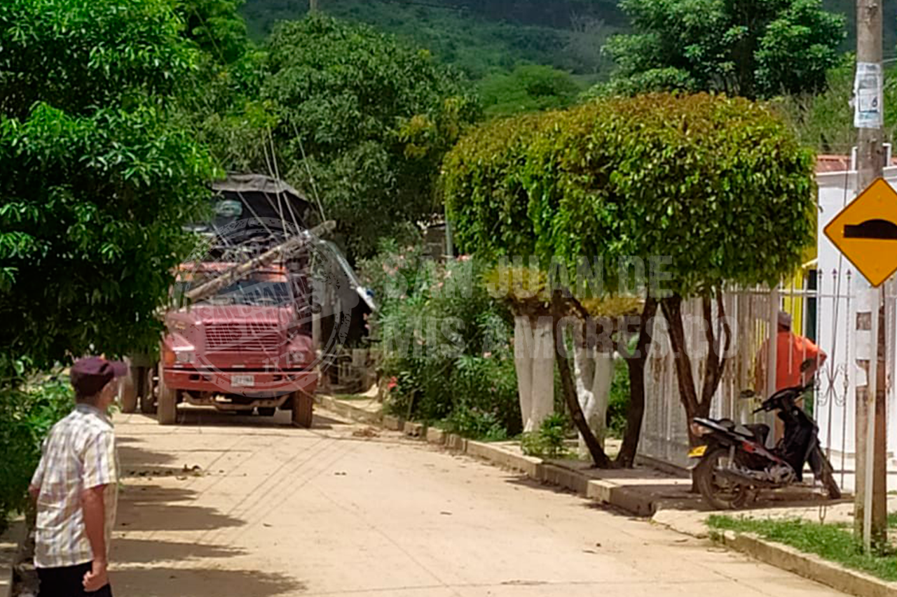 El conductor del vehículo explicó los hechos en los micrófonos de sanjuandemisamores.co, “Yo iba pasando en el camión, la copiloto que me acompañaba me avisa “¡El poste se viene encima!” y yo, gracias a Dios reaccioné y frené el vehículo. El poste afortunadamente no cayó en todo el carro, pero los cables me dañaron la carpa y torció unas varillas al carro”.